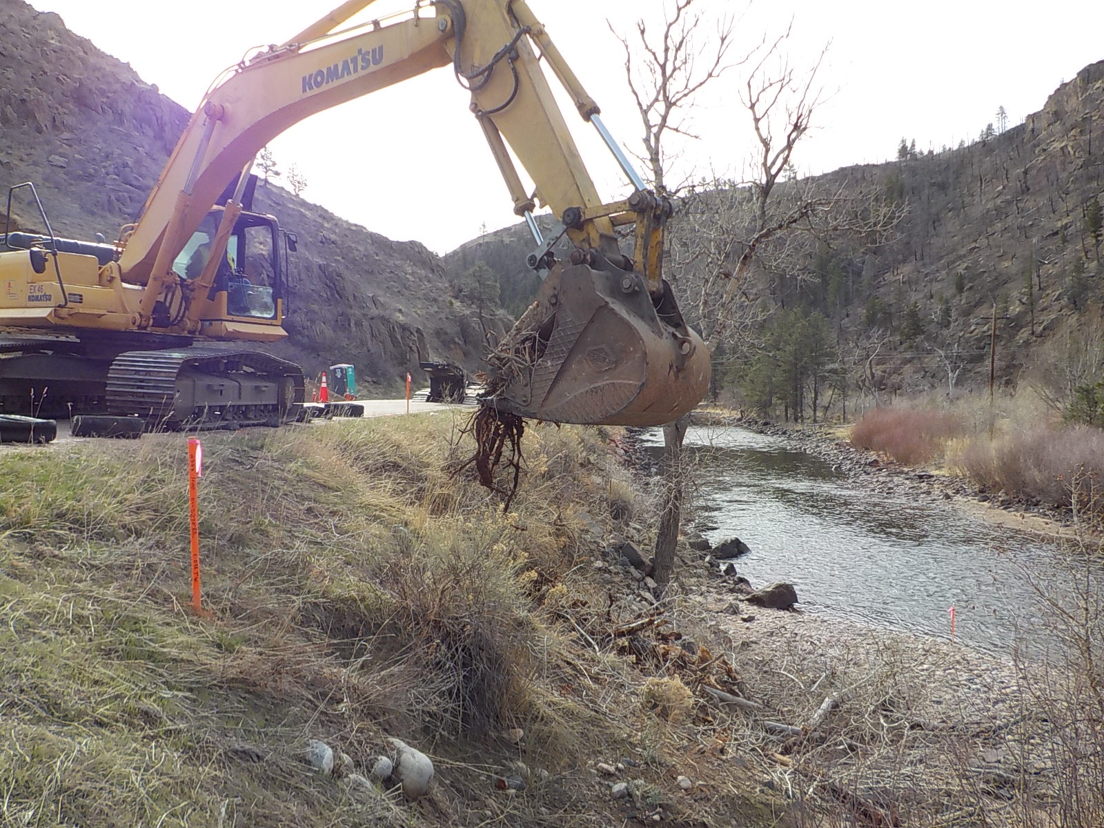 DEI was awarded the US 287 /SH 14 Flood Repairs project from the Colorado Department of Transportation. This project consists of Flood Repairs from the 2013 floods on SH 14. Detailed work includes removing 1,561 s.y. of pink rip rap up highway 14, installing 1,564 tons of 9” special rip rap, installing 140 l.f. of 36” RCP storm pipe with headwalls, 179 l.f. of reinforced RCP pipe, removal of 305 l.f. of type 3 guardrail, installation of approximately 3,200 c.y. of embankment material, installing of 1,200 c.y. of class A filter material, diverting the Cache La Poudre river 600 foot and dewatering and installing 1,200 c.y of rip rap.