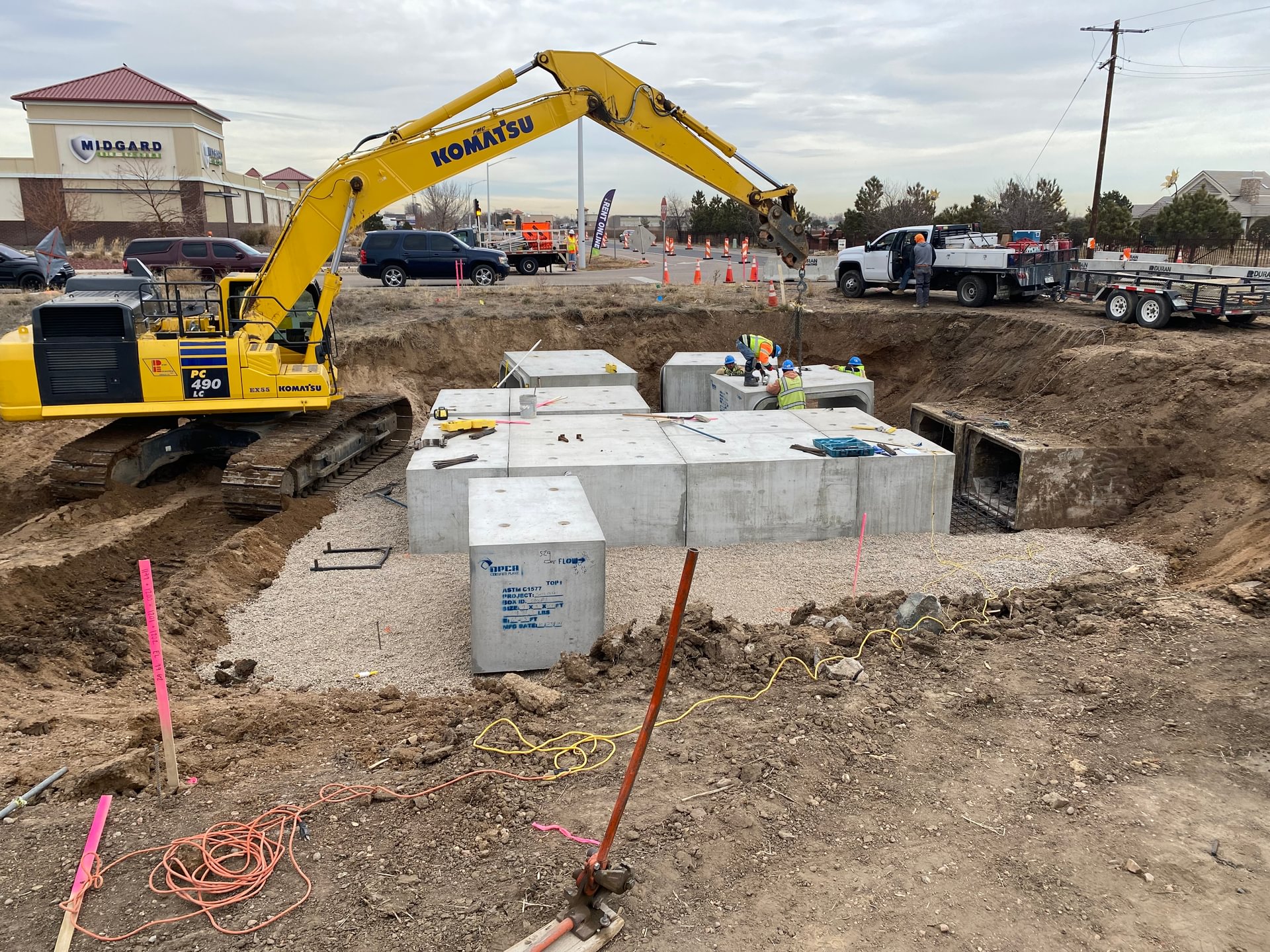 DEI was awarded the Anythink Nature Library Infrastructure project for the City of Thornton. Work includes infrastructure development for a future library. Detailed work includes installation of 625 l.f. of 8” waterline and lowerings, 1,476 l.f. of 8” sanitary sewer and manholes, installation of 453 l.f. of 24”-36” RCP storm sewer, inlets and manholes. Additional work includes clearing and grubbing unclassified excavation, replacement of asphalt and concrete curb, gutter, sidewalk and paving, landscape restoration, installation of traffic signals and electrical, surveying, traffic control, striping and signage.